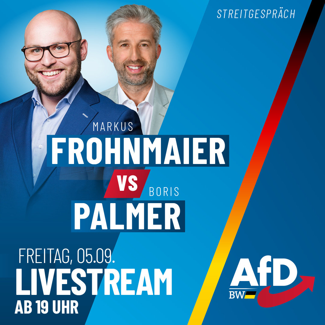 Am Freitag, den 5. September um 19:00 Uhr trifft unser Ministerpräsidentenkandidat und Landesvorsitzender Markus Frohnmaier in der Hermann-Hepper-Halle auf den Tübinger Oberbürgermeister Boris Palmer.